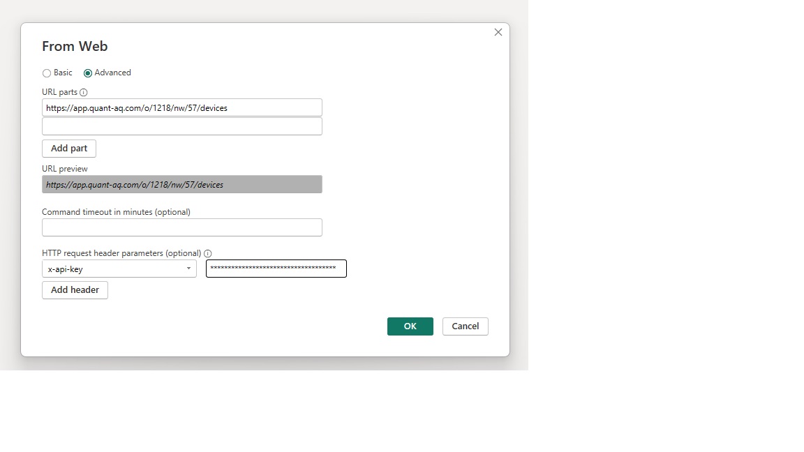 Hi–looks to me like you’re using the url from the web application in that dialog. To use the API, the url will be different, both in the domain (api.quant-aq.com) and the structure: QuantAQ Cloud API | QuantAQ Docs. For what it looks like you’re trying to do, I think something like https://api.quant-aq.com/v1/devices?org_id=1218&network_id=57 would probably work.